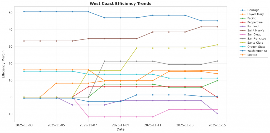 Figure 1: Efficiency margin trends for West Coast teams throughout the season. Teams trending upward show improving performance, while downward trends indicate struggles.