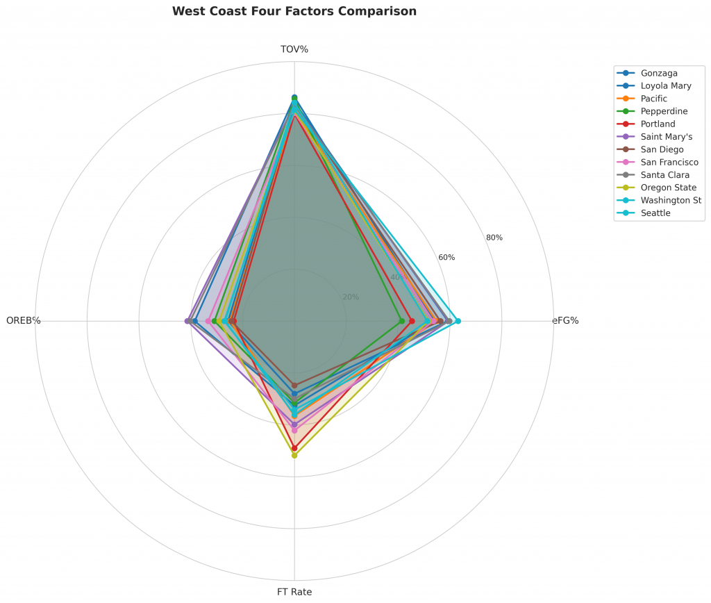 Figure 2: Four Factors comparison across West Coast teams. The radar chart shows each team’s offensive efficiency (eFG%), ball security (TOV%), rebounding (OREB%), and free throw generation (FT Rate).