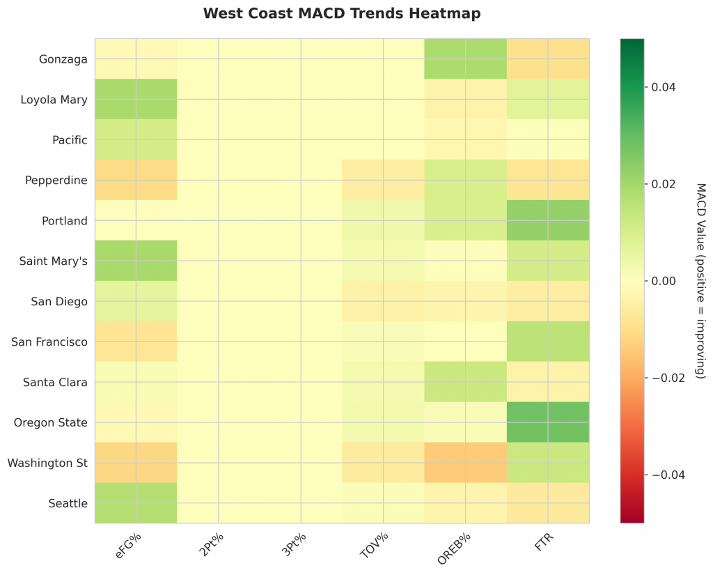 As West Coast teams continue their season, the MACD trending indicators will help identify which teams are genuinely improving versus those riding unsustainable momentum. Check back next week for updated analysis.
