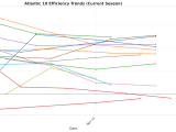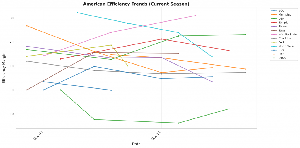Figure 1: Efficiency margin trends for American teams throughout the season. Teams trending upward show improving performance, while downward trends indicate struggles.