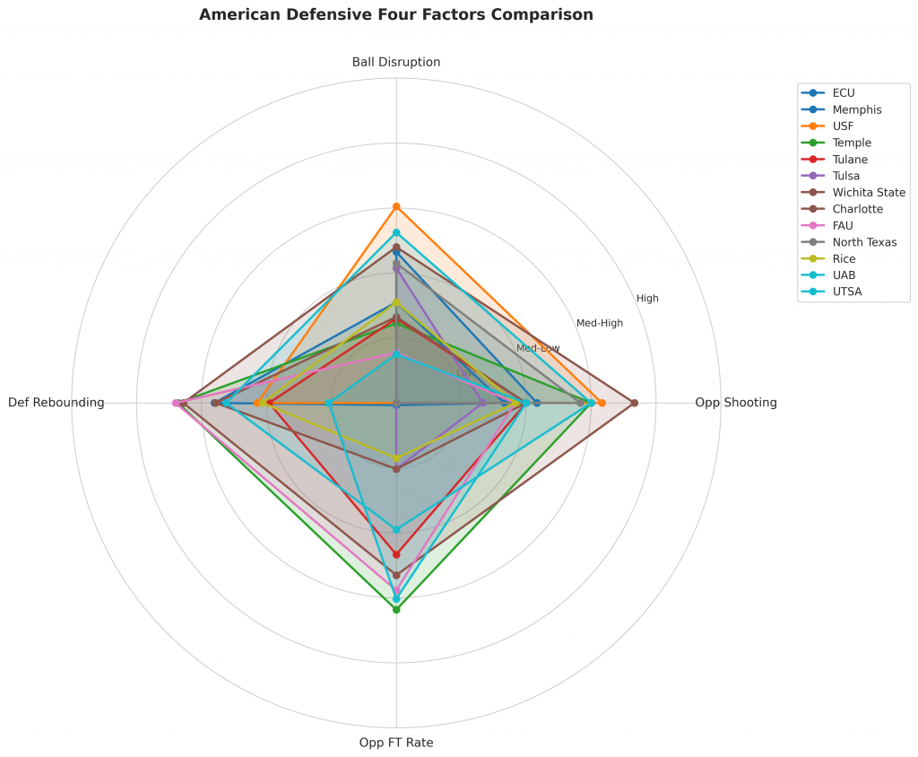 Figure 3: Defensive Four Factors comparison across American teams. The radar chart shows each team’s opponent shooting defense (Opp eFG%), ball disruption (forcing TOV%), defensive rebounding (DREB%), and opponent free throw prevention (Opp FT Rate).