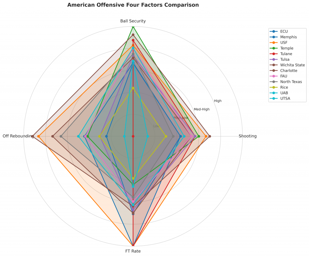 Figure 2: Offensive Four Factors comparison across American teams. The radar chart shows each team’s shooting efficiency (eFG%), ball security (TOV%), offensive rebounding (OREB%), and free throw generation (FT Rate).