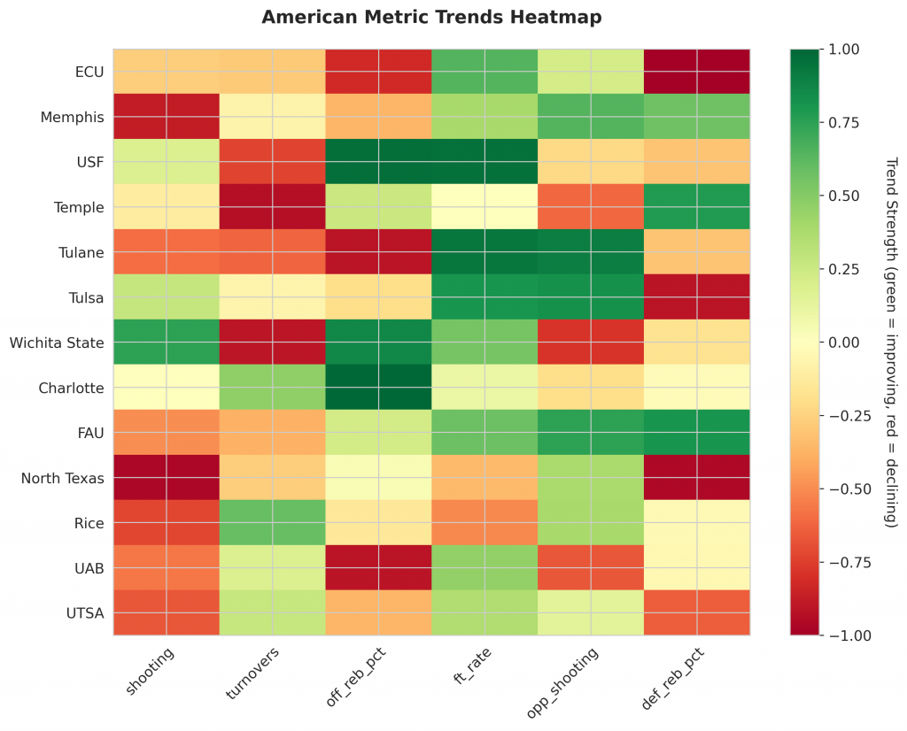 - Trending Down (Efficiency): ECU, Memphis, Temple, Tulane, Charlotte