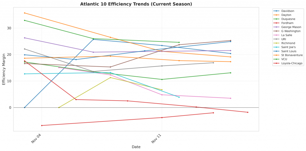 Figure 1: Efficiency margin trends for Atlantic 10 teams throughout the season. Teams trending upward show improving performance, while downward trends indicate struggles.