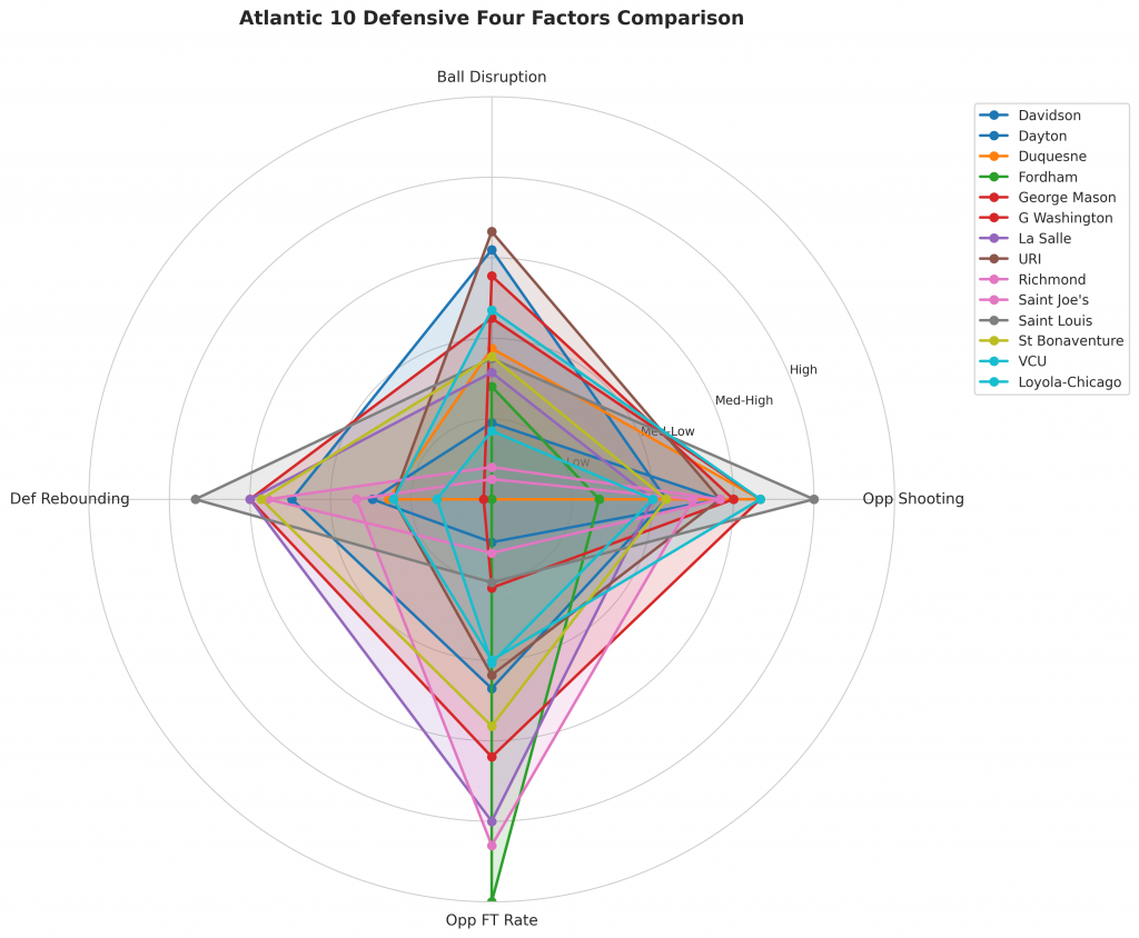 Figure 3: Defensive Four Factors comparison across Atlantic 10 teams. The radar chart shows each team’s opponent shooting defense (Opp eFG%), ball disruption (forcing TOV%), defensive rebounding (DREB%), and opponent free throw prevention (Opp FT Rate).
