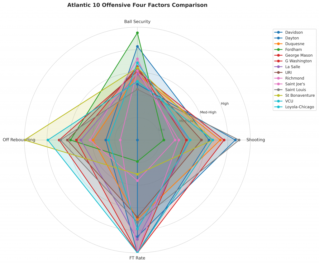 Figure 2: Offensive Four Factors comparison across Atlantic 10 teams. The radar chart shows each team’s shooting efficiency (eFG%), ball security (TOV%), offensive rebounding (OREB%), and free throw generation (FT Rate).