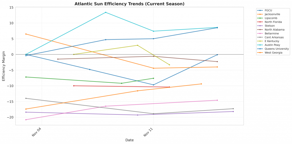 Figure 1: Efficiency margin trends for Atlantic Sun teams throughout the season. Teams trending upward show improving performance, while downward trends indicate struggles.