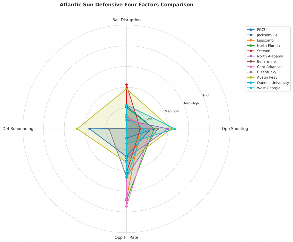 Figure 3: Defensive Four Factors comparison across Atlantic Sun teams. The radar chart shows each team’s opponent shooting defense (Opp eFG%), ball disruption (forcing TOV%), defensive rebounding (DREB%), and opponent free throw prevention (Opp FT Rate).