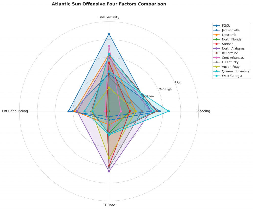 Figure 2: Offensive Four Factors comparison across Atlantic Sun teams. The radar chart shows each team’s shooting efficiency (eFG%), ball security (TOV%), offensive rebounding (OREB%), and free throw generation (FT Rate).