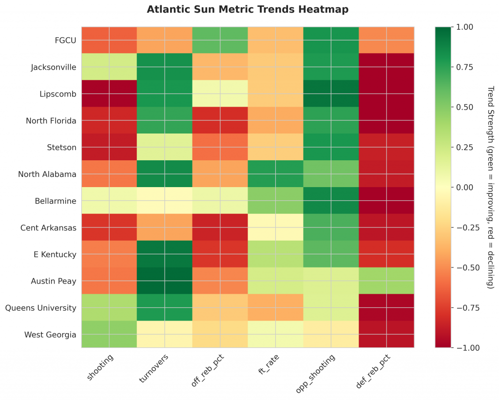 - Trending Down (Efficiency): FGCU, Lipscomb, North Florida, Stetson, North Alabama