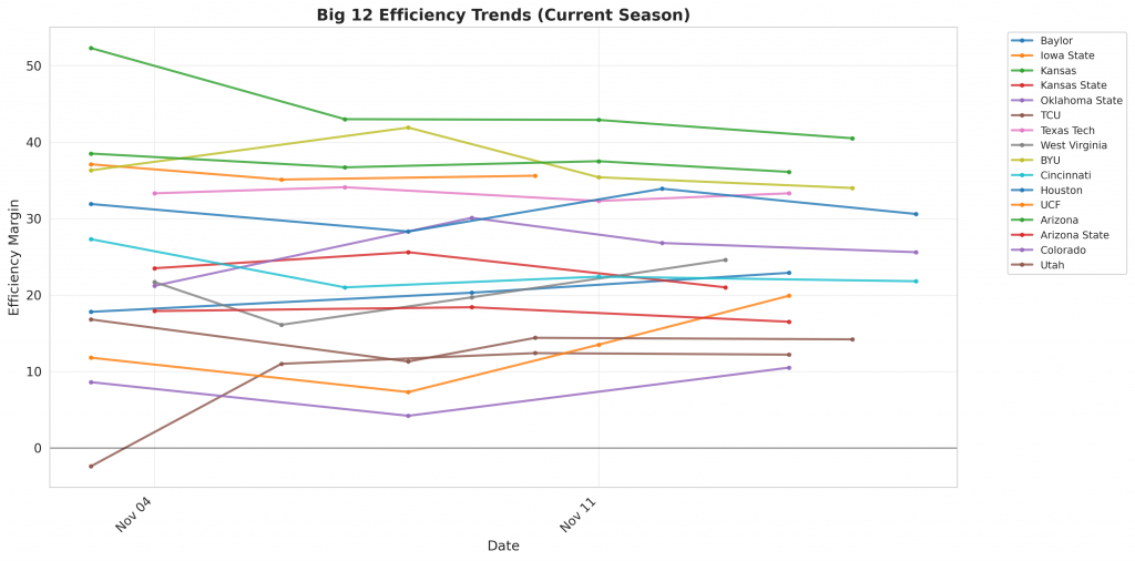 Figure 1: Efficiency margin trends for Big 12 teams throughout the season. Teams trending upward show improving performance, while downward trends indicate struggles.
