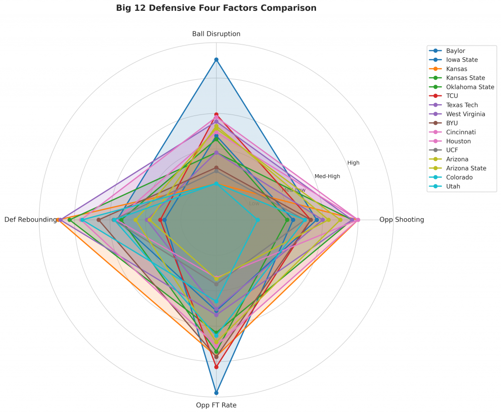 Figure 3: Defensive Four Factors comparison across Big 12 teams. The radar chart shows each team’s opponent shooting defense (Opp eFG%), ball disruption (forcing TOV%), defensive rebounding (DREB%), and opponent free throw prevention (Opp FT Rate).