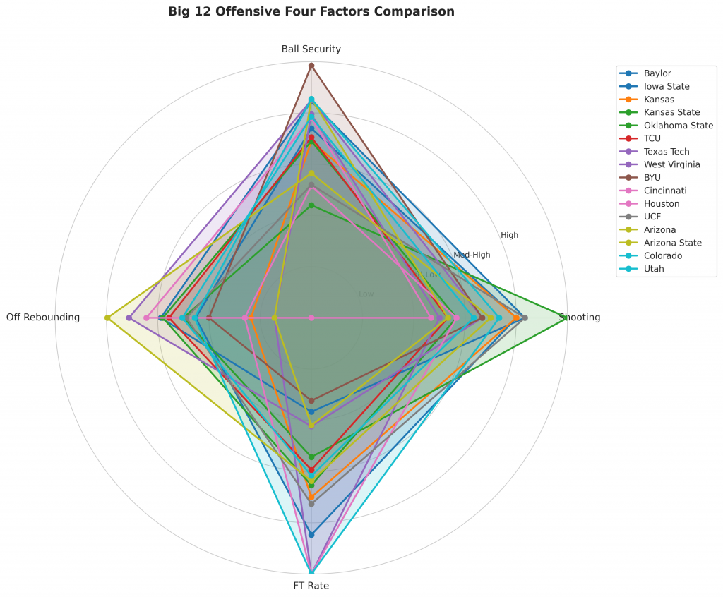 Figure 2: Offensive Four Factors comparison across Big 12 teams. The radar chart shows each team’s shooting efficiency (eFG%), ball security (TOV%), offensive rebounding (OREB%), and free throw generation (FT Rate).