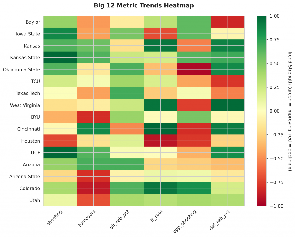 - Trending Up (Efficiency): Baylor, Iowa State, Kansas, Kansas State, Oklahoma State