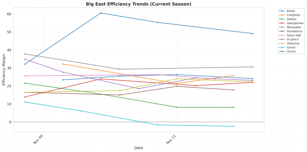 Figure 1: Efficiency margin trends for Big East teams throughout the season. Teams trending upward show improving performance, while downward trends indicate struggles.