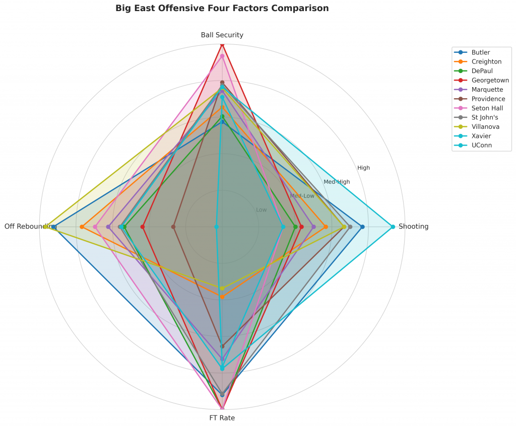 Figure 2: Offensive Four Factors comparison across Big East teams. The radar chart shows each team’s shooting efficiency (eFG%), ball security (TOV%), offensive rebounding (OREB%), and free throw generation (FT Rate).