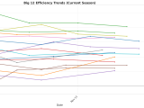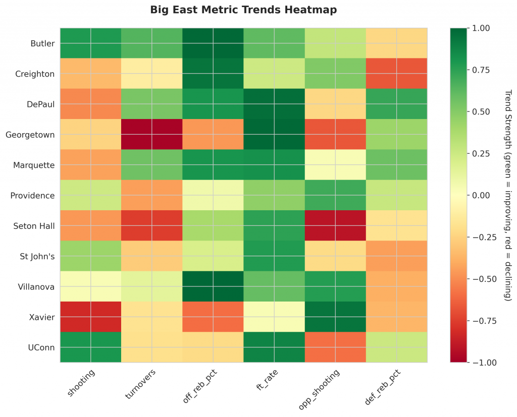 - Trending Down (Efficiency): Creighton, DePaul, Georgetown, Marquette, Seton Hall