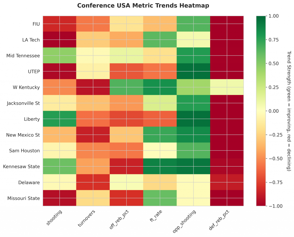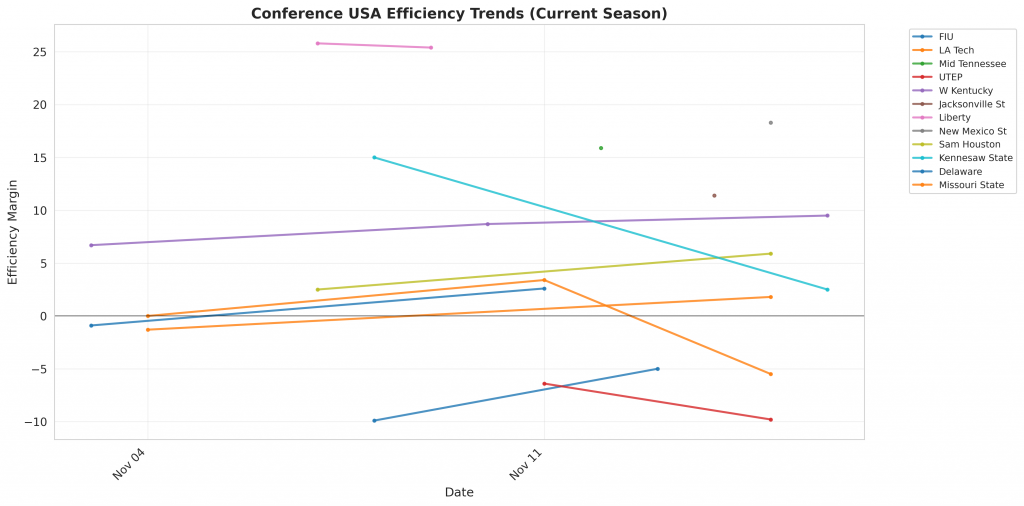 Figure 1: Efficiency margin trends for Conference USA teams throughout the season. Teams trending upward show improving performance, while downward trends indicate struggles.