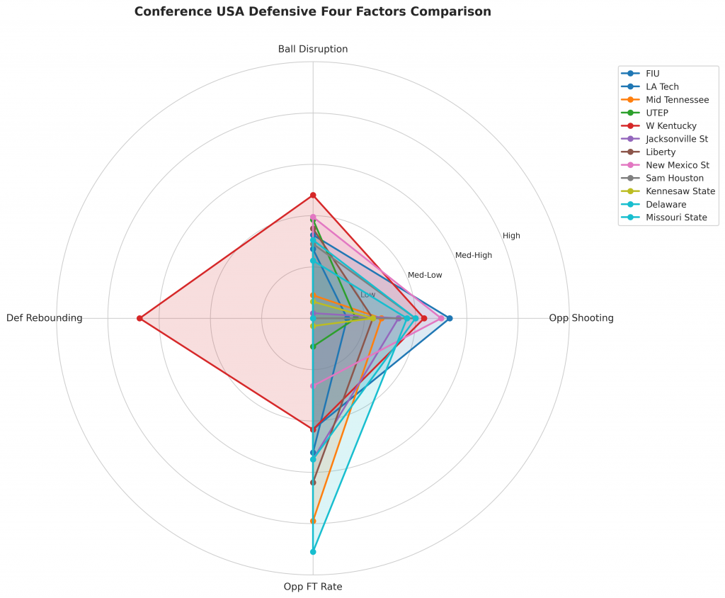 Figure 3: Defensive Four Factors comparison across Conference USA teams. The radar chart shows each team’s opponent shooting defense (Opp eFG%), ball disruption (forcing TOV%), defensive rebounding (DREB%), and opponent free throw prevention (Opp FT Rate).