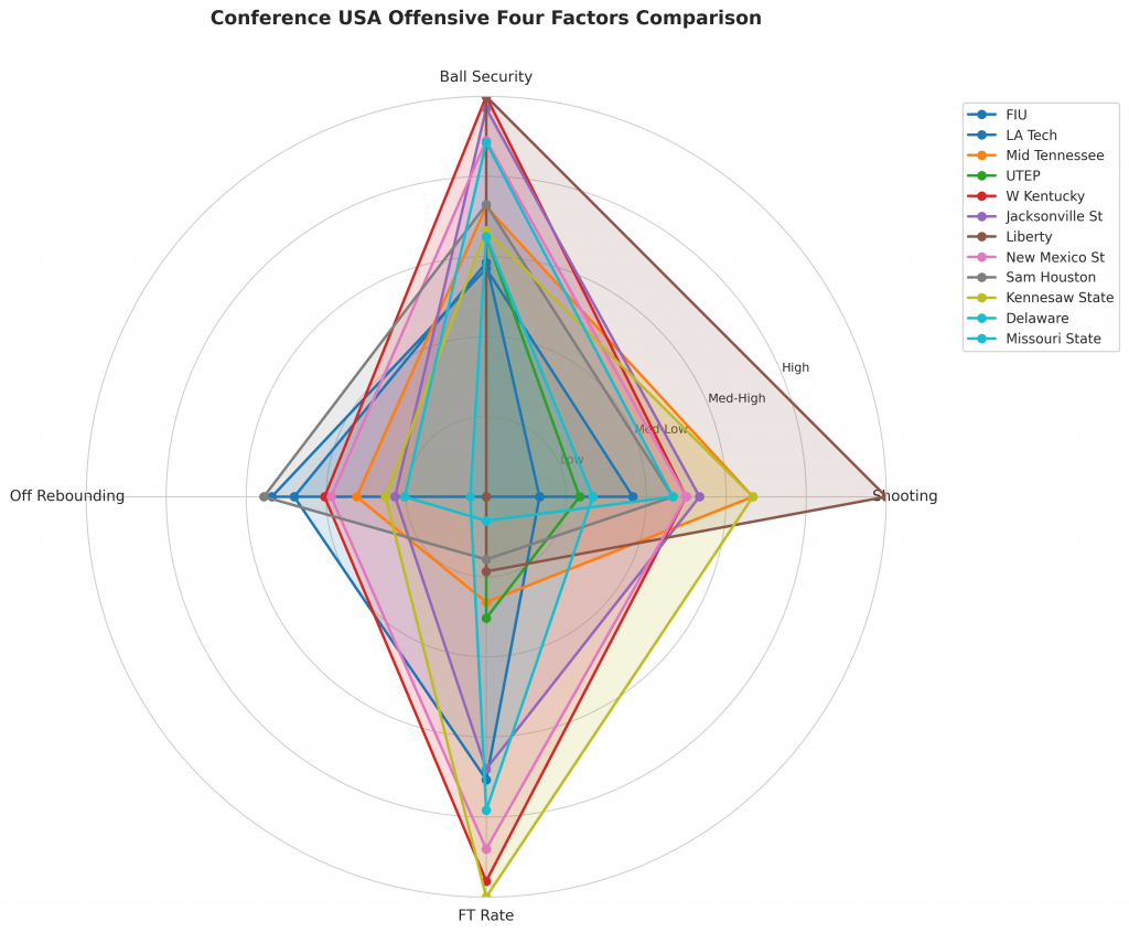 Figure 2: Offensive Four Factors comparison across Conference USA teams. The radar chart shows each team’s shooting efficiency (eFG%), ball security (TOV%), offensive rebounding (OREB%), and free throw generation (FT Rate).