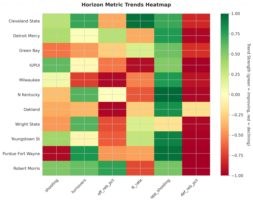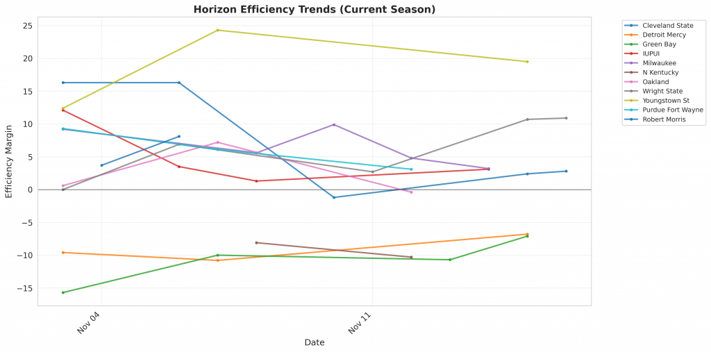 Figure 1: Efficiency margin trends for Horizon teams throughout the season. Teams trending upward show improving performance, while downward trends indicate struggles.