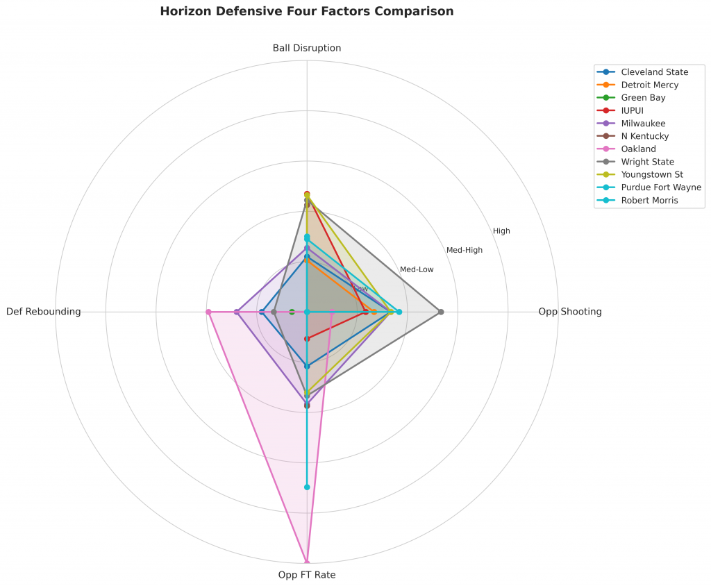 Figure 3: Defensive Four Factors comparison across Horizon teams. The radar chart shows each team’s opponent shooting defense (Opp eFG%), ball disruption (forcing TOV%), defensive rebounding (DREB%), and opponent free throw prevention (Opp FT Rate).