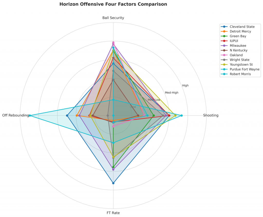 Figure 2: Offensive Four Factors comparison across Horizon teams. The radar chart shows each team’s shooting efficiency (eFG%), ball security (TOV%), offensive rebounding (OREB%), and free throw generation (FT Rate).
