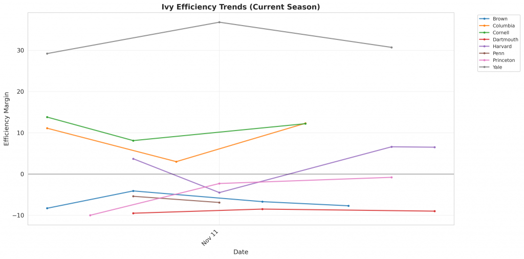 Figure 1: Efficiency margin trends for Ivy teams throughout the season. Teams trending upward show improving performance, while downward trends indicate struggles.