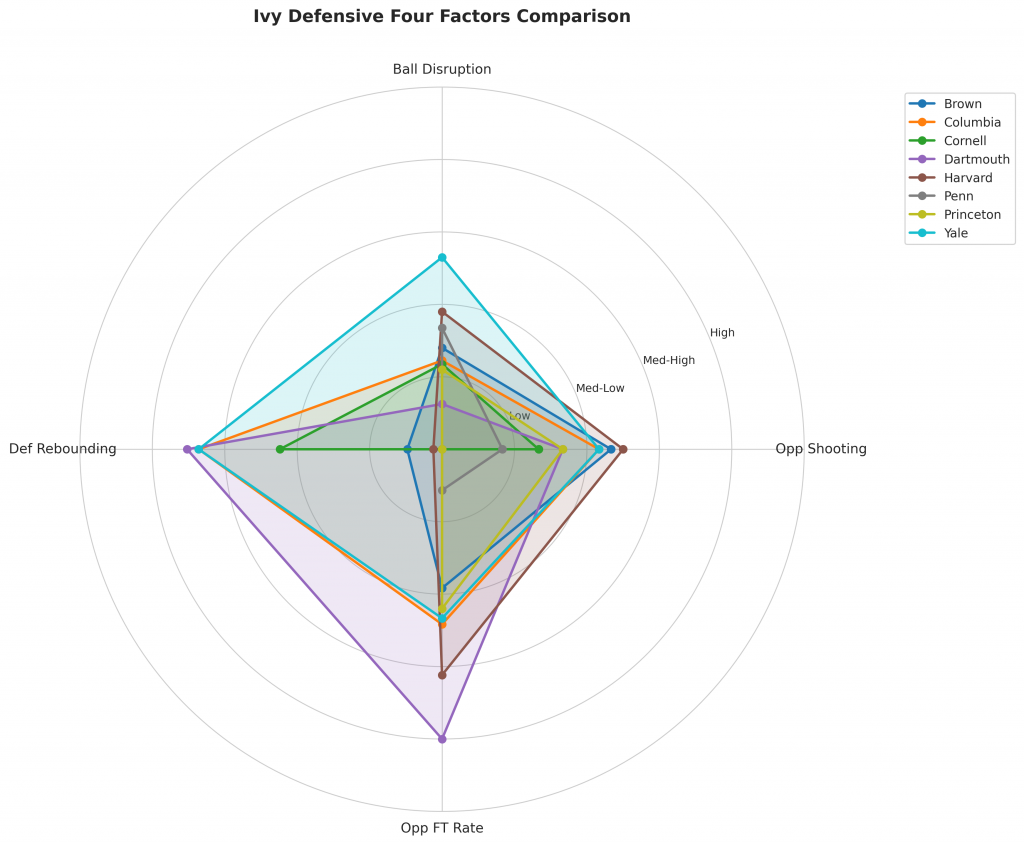 Figure 3: Defensive Four Factors comparison across Ivy teams. The radar chart shows each team’s opponent shooting defense (Opp eFG%), ball disruption (forcing TOV%), defensive rebounding (DREB%), and opponent free throw prevention (Opp FT Rate).