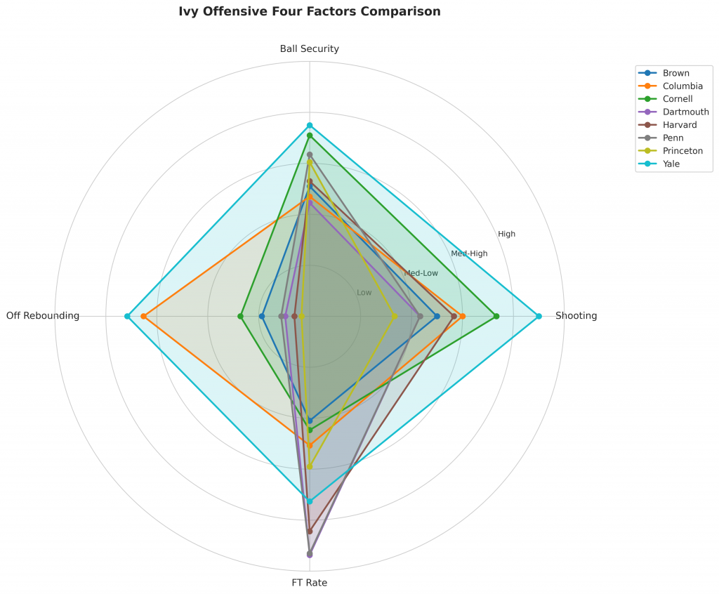 Figure 2: Offensive Four Factors comparison across Ivy teams. The radar chart shows each team’s shooting efficiency (eFG%), ball security (TOV%), offensive rebounding (OREB%), and free throw generation (FT Rate).