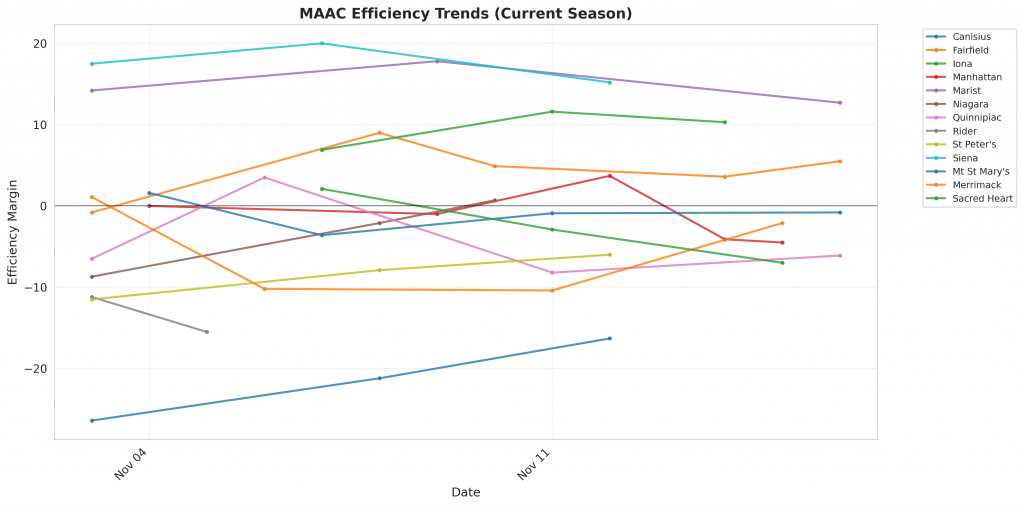 Figure 1: Efficiency margin trends for MAAC teams throughout the season. Teams trending upward show improving performance, while downward trends indicate struggles.