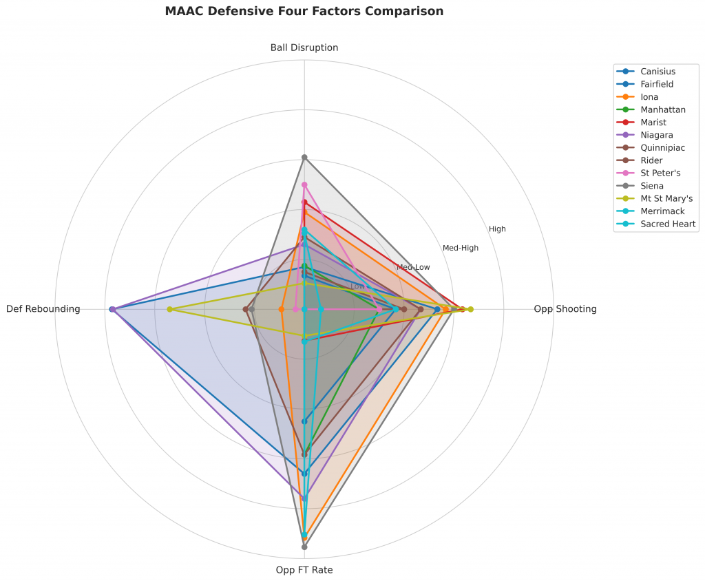 Figure 3: Defensive Four Factors comparison across MAAC teams. The radar chart shows each team’s opponent shooting defense (Opp eFG%), ball disruption (forcing TOV%), defensive rebounding (DREB%), and opponent free throw prevention (Opp FT Rate).