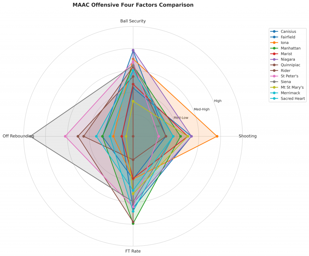 Figure 2: Offensive Four Factors comparison across MAAC teams. The radar chart shows each team’s shooting efficiency (eFG%), ball security (TOV%), offensive rebounding (OREB%), and free throw generation (FT Rate).