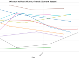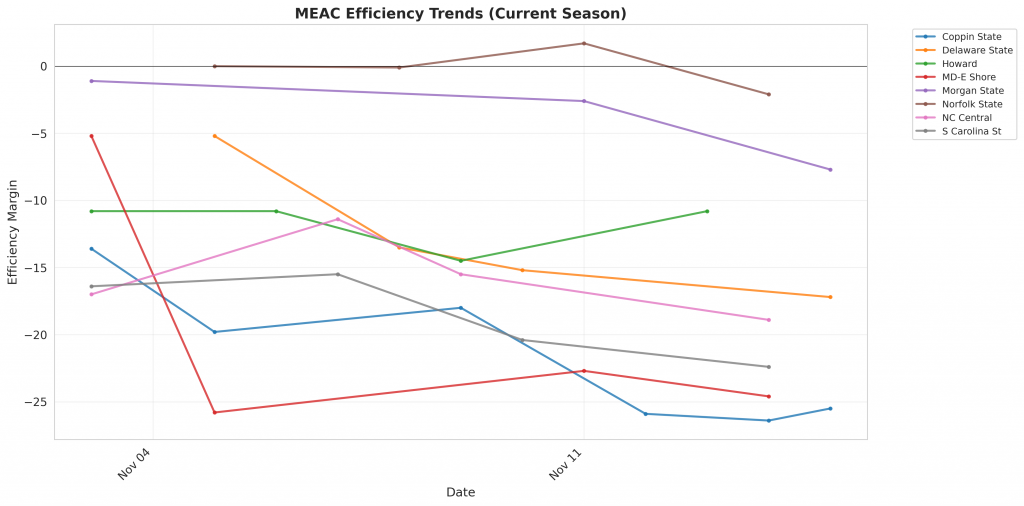 Figure 1: Efficiency margin trends for MEAC teams throughout the season. Teams trending upward show improving performance, while downward trends indicate struggles.