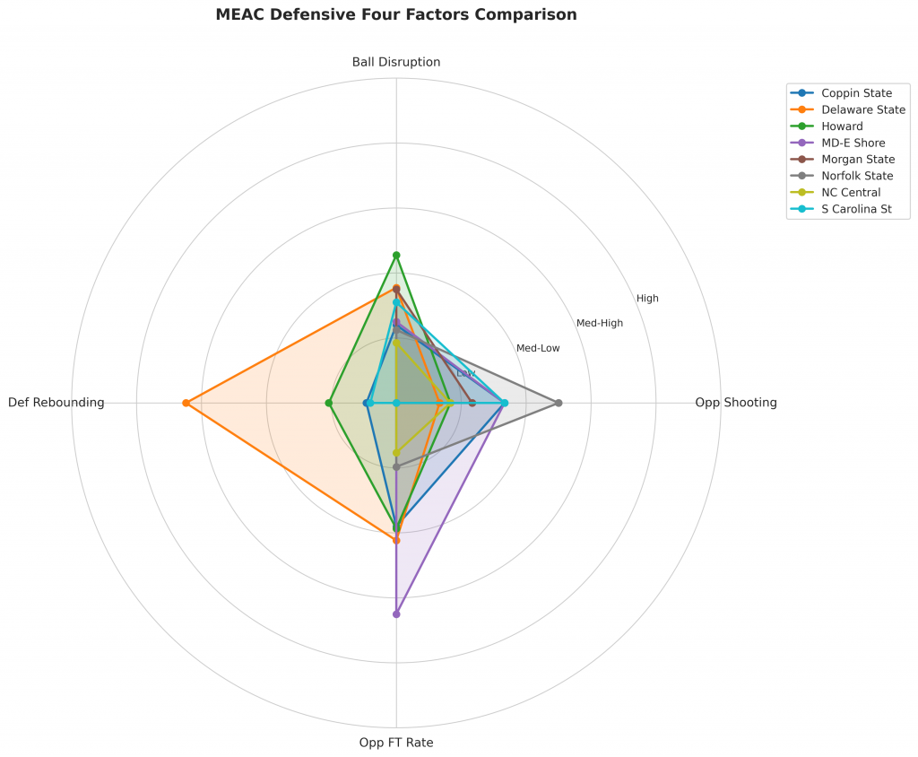 Figure 3: Defensive Four Factors comparison across MEAC teams. The radar chart shows each team’s opponent shooting defense (Opp eFG%), ball disruption (forcing TOV%), defensive rebounding (DREB%), and opponent free throw prevention (Opp FT Rate).