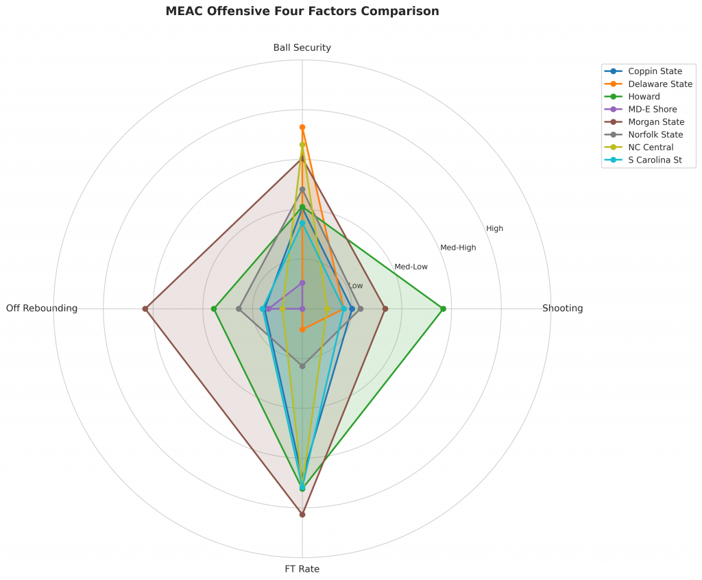 Figure 2: Offensive Four Factors comparison across MEAC teams. The radar chart shows each team’s shooting efficiency (eFG%), ball security (TOV%), offensive rebounding (OREB%), and free throw generation (FT Rate).