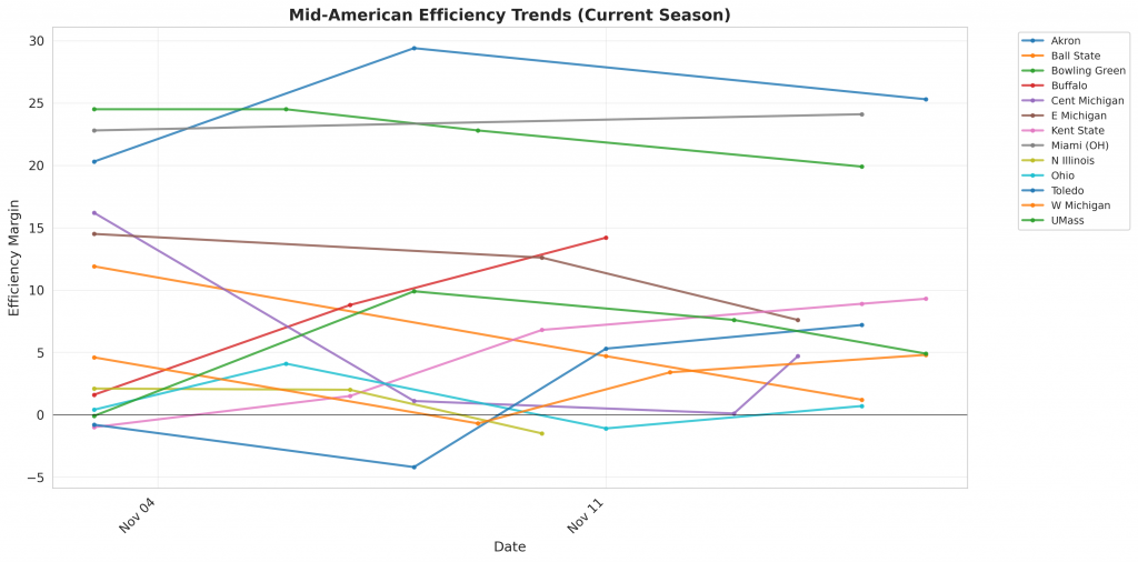 Figure 1: Efficiency margin trends for Mid-American teams throughout the season. Teams trending upward show improving performance, while downward trends indicate struggles.
