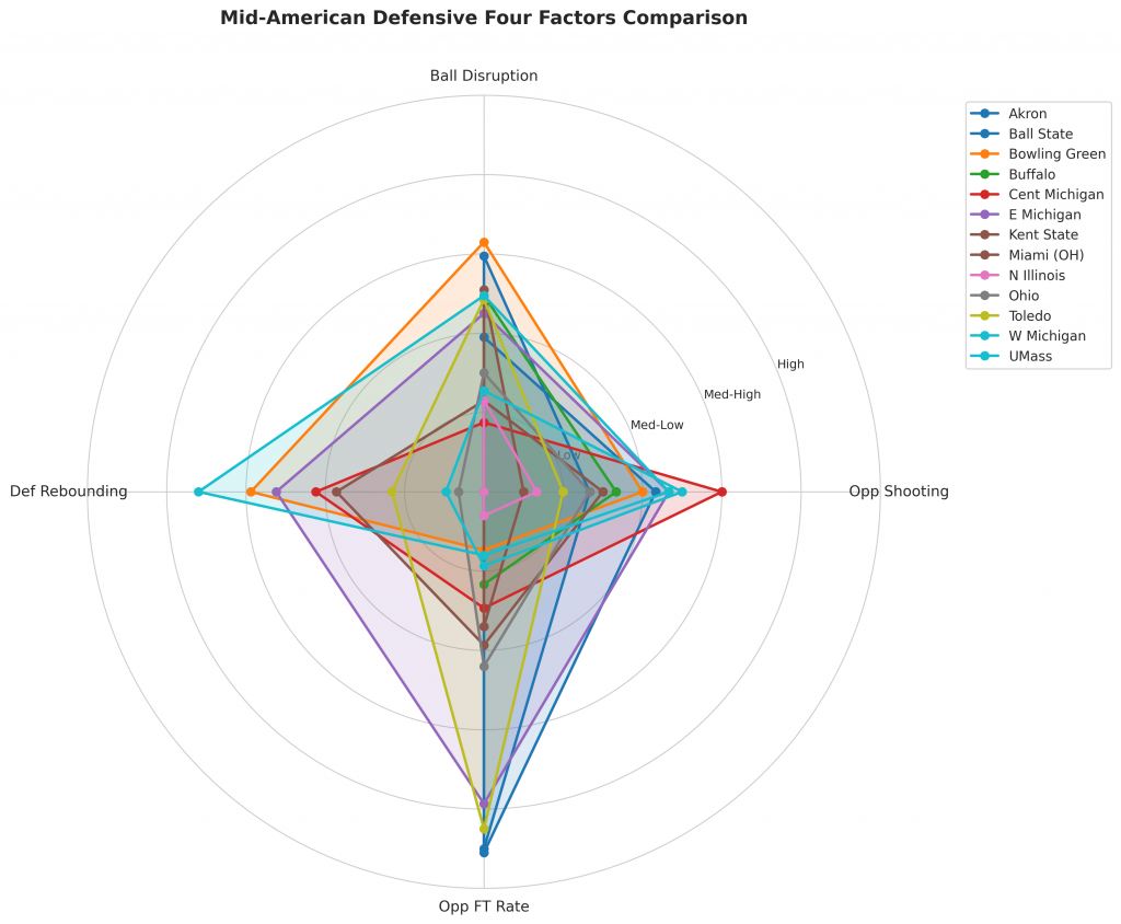 Figure 3: Defensive Four Factors comparison across Mid-American teams. The radar chart shows each team’s opponent shooting defense (Opp eFG%), ball disruption (forcing TOV%), defensive rebounding (DREB%), and opponent free throw prevention (Opp FT Rate).