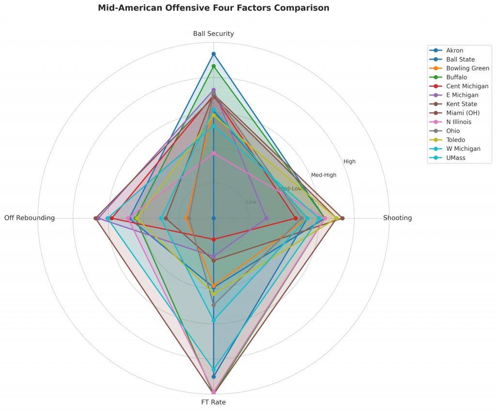 Figure 2: Offensive Four Factors comparison across Mid-American teams. The radar chart shows each team’s shooting efficiency (eFG%), ball security (TOV%), offensive rebounding (OREB%), and free throw generation (FT Rate).