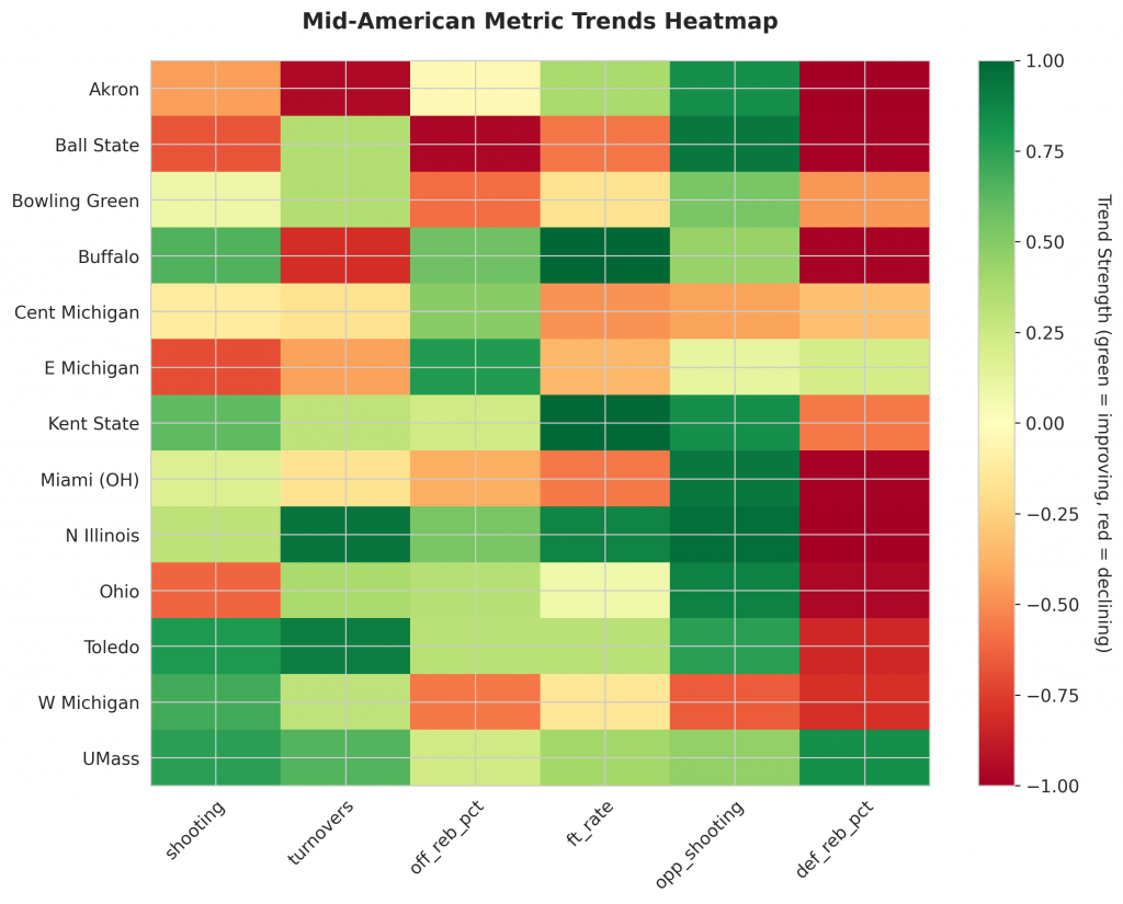 - Trending Down (Efficiency): Akron, Ball State, Cent Michigan, E Michigan, Ohio