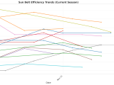 - Trending Down (Efficiency): Alabama, Auburn, Florida, Texas