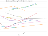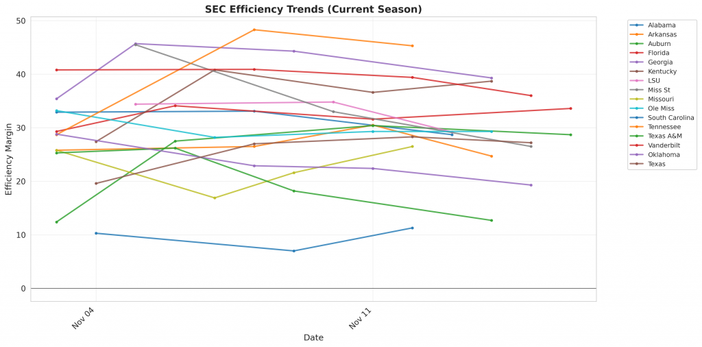 Figure 1: Efficiency margin trends for SEC teams throughout the season. Teams trending upward show improving performance, while downward trends indicate struggles.