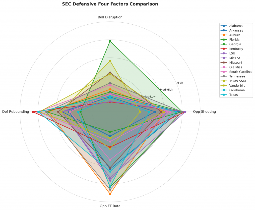 Figure 3: Defensive Four Factors comparison across SEC teams. The radar chart shows each team’s opponent shooting defense (Opp eFG%), ball disruption (forcing TOV%), defensive rebounding (DREB%), and opponent free throw prevention (Opp FT Rate).