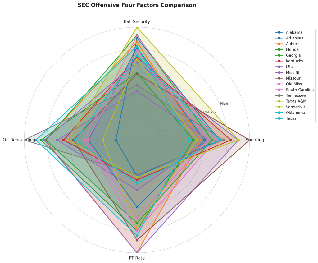 Figure 2: Offensive Four Factors comparison across SEC teams. The radar chart shows each team’s shooting efficiency (eFG%), ball security (TOV%), offensive rebounding (OREB%), and free throw generation (FT Rate).