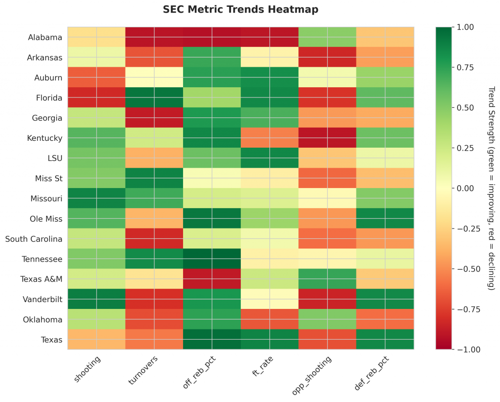 - Trending Up (Efficiency): Arkansas, Georgia, Kentucky, LSU, Miss St