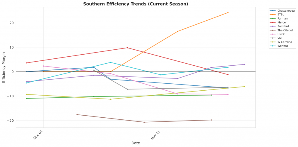 Figure 1: Efficiency margin trends for Southern teams throughout the season. Teams trending upward show improving performance, while downward trends indicate struggles.