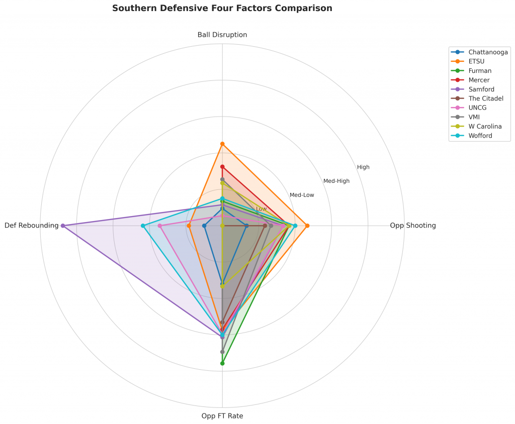Figure 3: Defensive Four Factors comparison across Southern teams. The radar chart shows each team’s opponent shooting defense (Opp eFG%), ball disruption (forcing TOV%), defensive rebounding (DREB%), and opponent free throw prevention (Opp FT Rate).