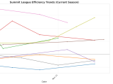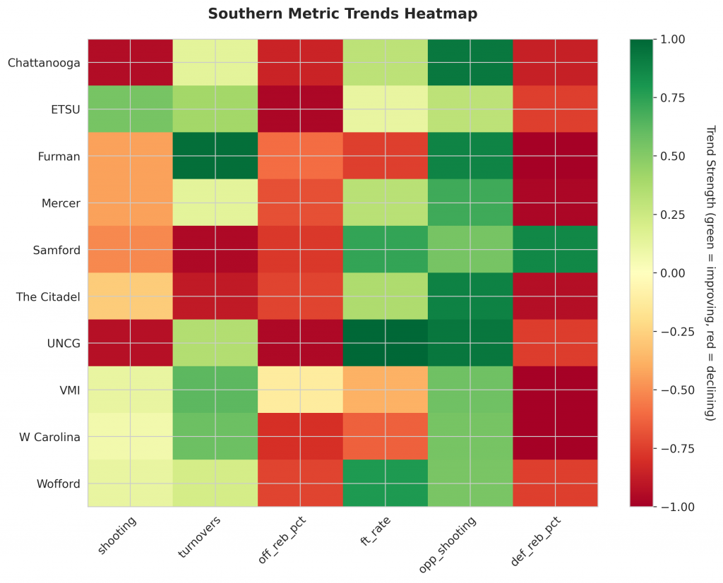 - Trending Down (Efficiency): Chattanooga, Furman, Mercer, Samford, The Citadel