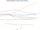 - Trending Down (Efficiency): North Dakota St, Omaha, Oral Roberts, South Dakota, South Dakota St