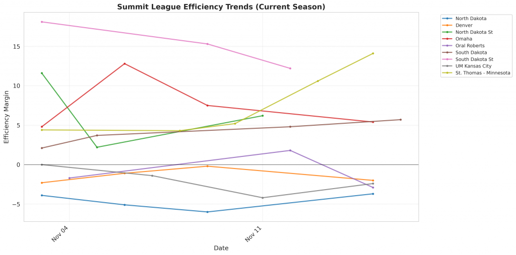 Figure 1: Efficiency margin trends for Summit League teams throughout the season. Teams trending upward show improving performance, while downward trends indicate struggles.